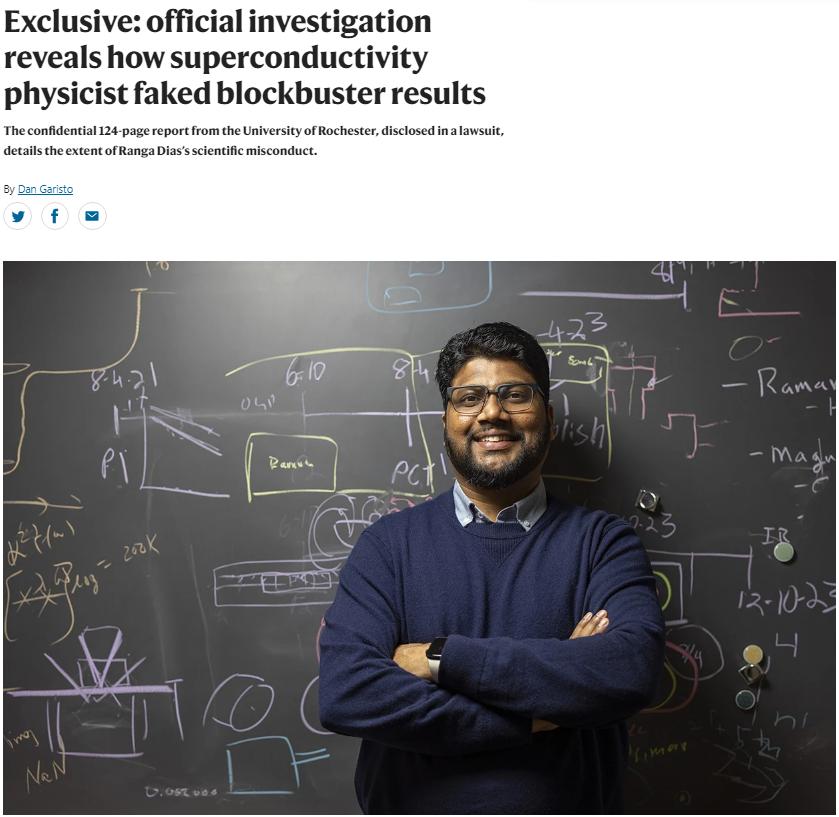 罗切斯特大学此次长达124页的调查报告详细介绍了迪亚斯在上述三篇被撤回的论文以及另外一篇在《化学通讯》上被撤回的论文中的欺骗行为。在两篇曾发表在《自然》的论文中,迪亚斯先是声称在一种由碳、硫和氢(下称CSH)组成的化合物中发现了室温超导电性(即在环境温度下电阻为零),后又声称在一种由镥和氢(下称LuH) 组成的化合物中发现了室温超导性。