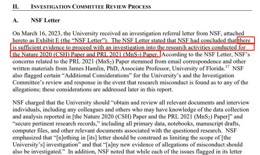 2021年~2022年期间,该校对迪亚斯团队在《自然》杂志发表的CSH化合物室温超导论文进行了三次初步“调查”。第一次初步调查是在加州大学圣迭戈分校的凝聚态理论家豪尔赫·赫希(Jorge Hirsch)向罗切斯特大学提出投诉后启动的。校方询问了三位未具名的内部审查员,迪亚斯则联系了一位外部审查员来审查赫希的投诉。调查报告的信息显示,该外部审查员是伊利诺伊州莱蒙特市阿贡国家实验室的物理学家马杜里·索马亚祖鲁(Somayazulu)。