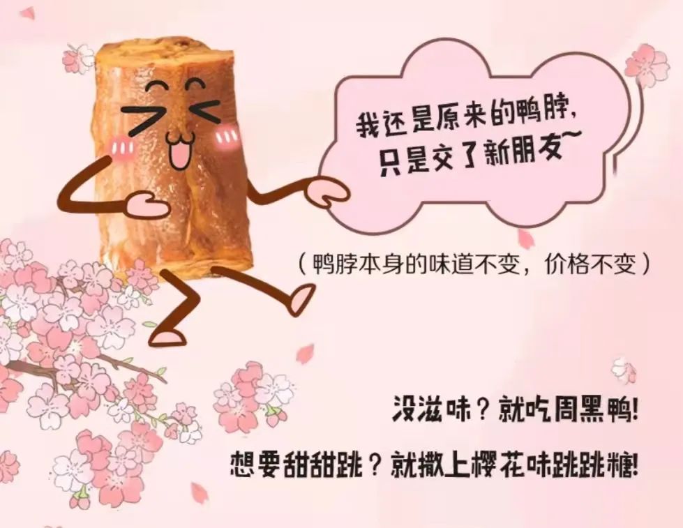 比如周黑鸭在前年推出的周黑鸭樱花跳跳糖味鸭脖。买鸭脖,送一包樱花味的跳跳糖,蘸着吃就成了“樱花限定”。
