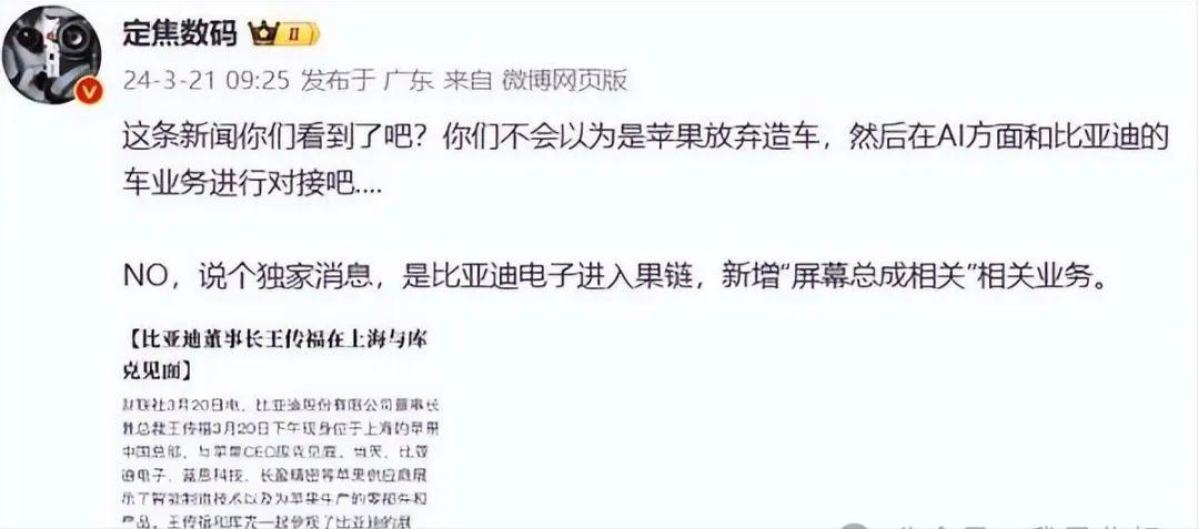 王传福与库克的会面背后,根据业内人士曝光,这次是比亚迪打入了苹果供应链,新增“屏幕总成相关”的业务。