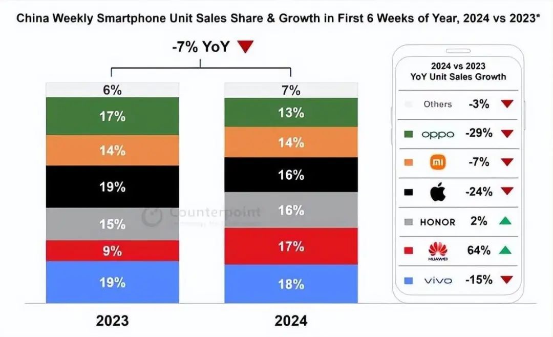 苹果这种背后转变的关键,其实就是华为的崛起。在今年前六周,华为市占率从9.4%上升到了16.5%,超越了苹果。
