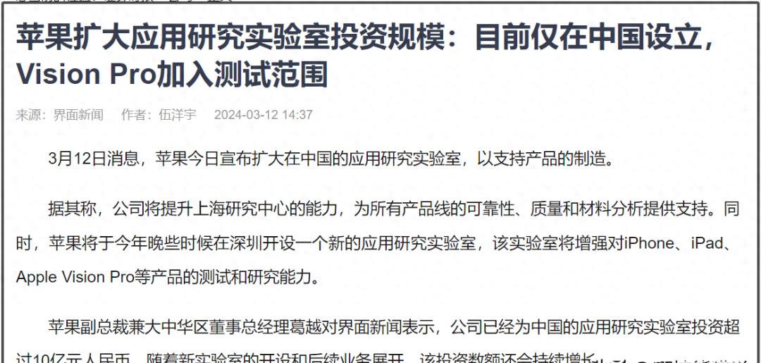 苹果在中国大陆地区的第57家门店Apple Store静安寺店正式开业,也将在中国投资应用研究实验室,投资金额高达10个亿,而且这种实验室只有中国才有。