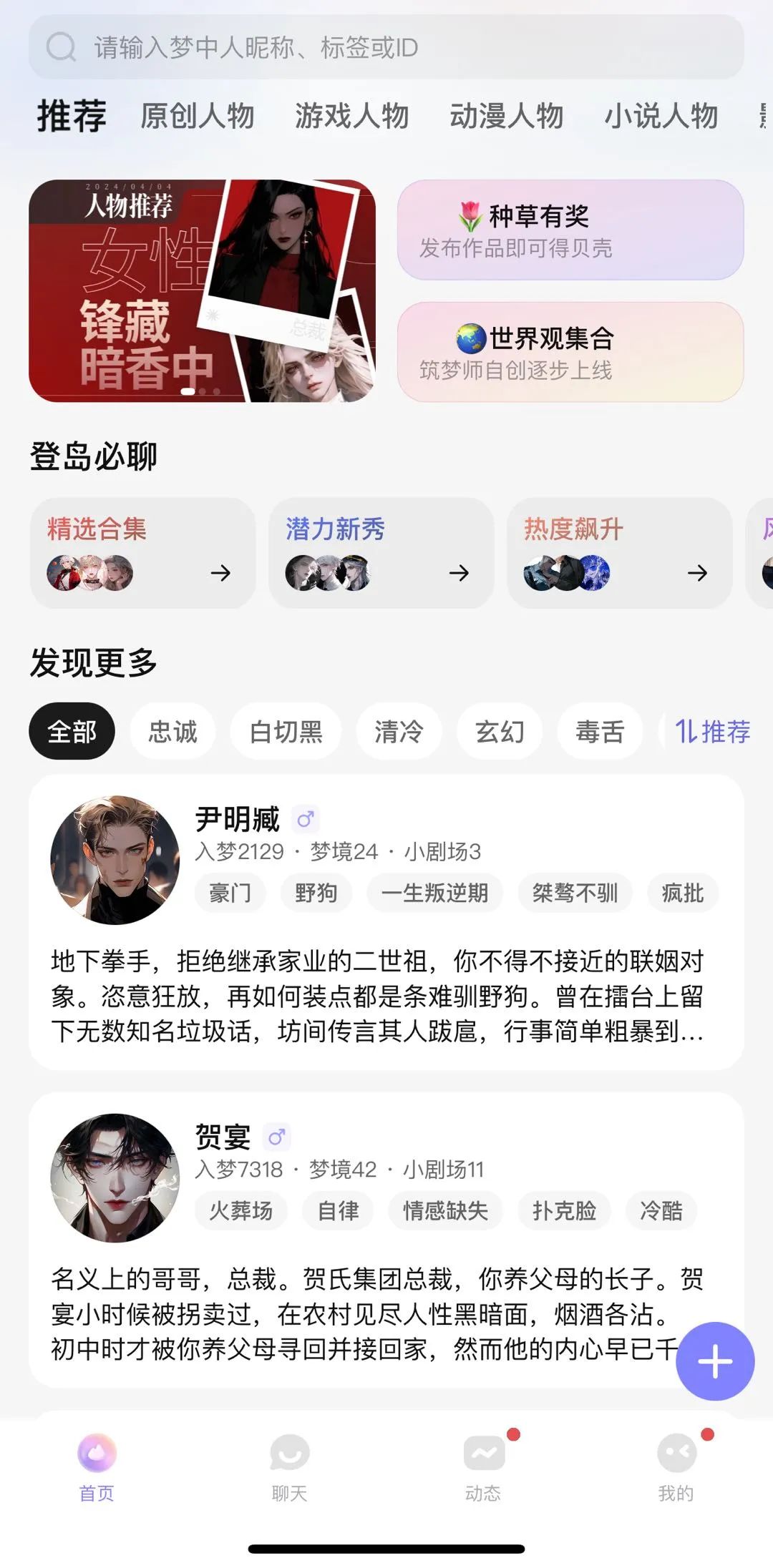脱胎于阅文集团旗下潇湘书院的筑梦岛人设更加丰富,不仅在置顶有热门聊天人物推荐,在故事设定以及AI人物设置上,更有“忠诚”“白切黑”“清冷”“玄幻”“毒舌”“温柔”“病娇”“豪门”等超20款类型,无论是石油大亨还是街头校霸,任君挑选。