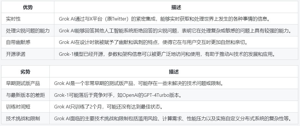 而GPT的多数产品不行,比如GPT3.5,其信息截至2021年;比如GPT-4 Turbo,信息更新至2023年4月。但Grok AI也有明显的缺点,比如训练时间短,属于早期测试产品,部门功能弱于GPT-4 Turbo。