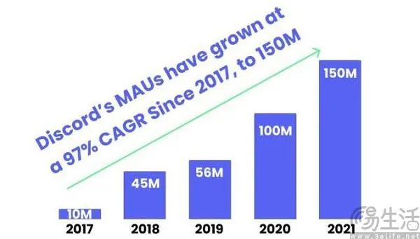 在此之前,Discord主要有两个营收方式,分别是向各个服务器创建者提供各种付费机器人协助系统,以及9.99美元/月的高级订阅计划Discord Nitro,并将向用户提供高质量视频、自定义表情、个性化页面和Gif头像在内的多项服务。借助急剧膨胀的用户规模所带来的订阅数量增长,Discord的年收入从2019年的4500万美元也扩大到了2021年的3亿美元。