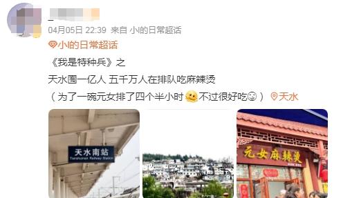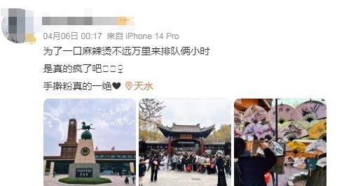 文旅部发布的数据也显示:“游客量涨幅超过50%的目的地城市分别为泰安、淄博、天水、开封、景德镇。”其中,近期因麻辣烫火出圈的甘肃天水持续“热辣滚烫”,旅游订单量同比增长超21倍。社交媒体上,多位网友提到,去天水旅游时,吃麻辣烫排长队,有人甚至排队时间超4个小时。