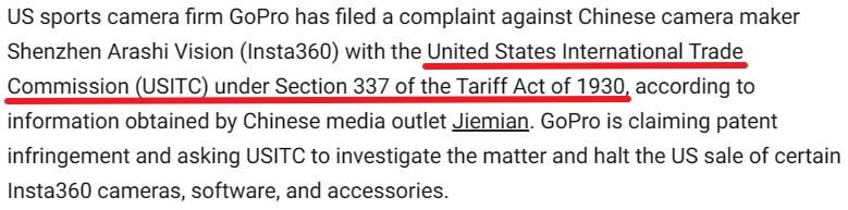 但是竞品竞争,假如一方认为侵权了,那么可以去法院起诉,然而 GoPro 用了一个可能算是 “ 阴招 ” 的办法,选择申请 337 调查。