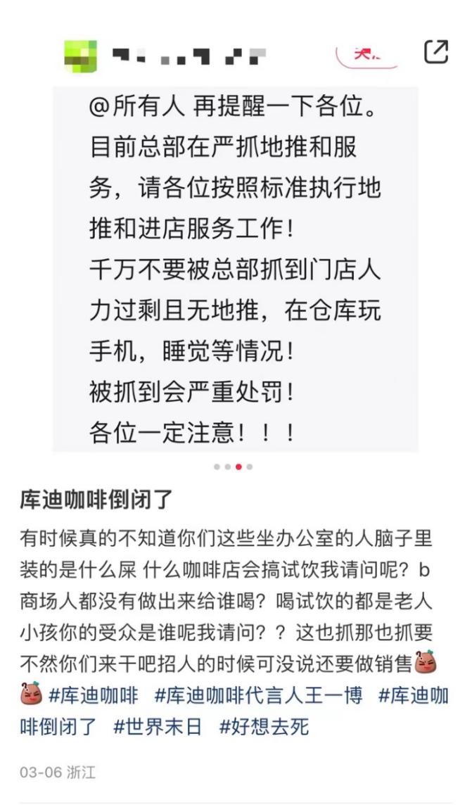 差评如潮,库迪不去想着提高研发能力,反而不惜降低品牌调性,在门店大搞试喝、做地推来拉销量,既引得消费者反感,又进一步削弱了联营商信心。