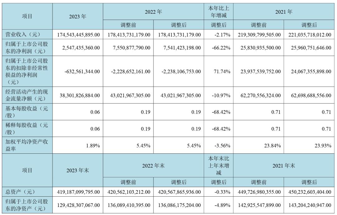 相比之下,京东方去年的业绩表现也不够理想。根据4月1日公布的2023年度报告,京东方全年营收1745.43亿元,同比下滑2.17%;归母净利润25.47亿元,同比下滑66.22%;扣非净利润-6.33亿元,同比大增71.74%。