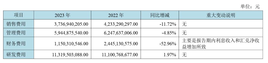 值得注意的是,京东方2023年三费均有不同程度的下降,其中财务费用同比骤降52.96%,财报中解释为利息收入和汇兑净收益增加所致。这在一定程度上的确可以让财报数字更好看,但这是不是一种持续可行的手段还有待观察。从长远来看,京东方可能更需要提高主营业务的盈利能力。