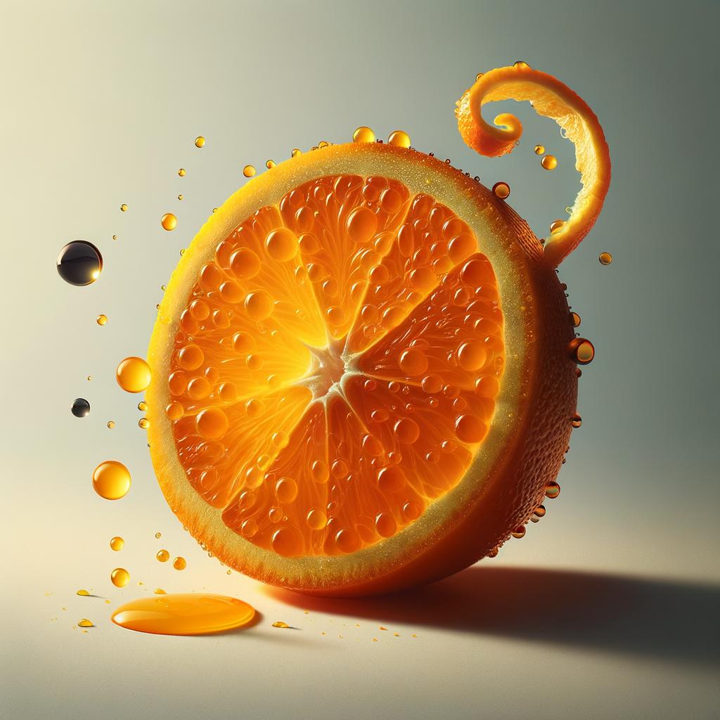 A glistening orange slice is the focal point, its surface dotted with beads of juice. A soft, pale backdrop provides a minimalist stage that accentuates the subject. Dark, spherical beads adorn the slice, droplets, set against a curling strip of textured orange peel. The composition captures a small droplet of juice mid-flight, adding a sense of dynamic movement. This still-life arrangement celebrates the vivid colours and textures of citrus, inviting the viewer to sense the fresh, tangy aroma and flavour, encapsulating the artistry in nature's design