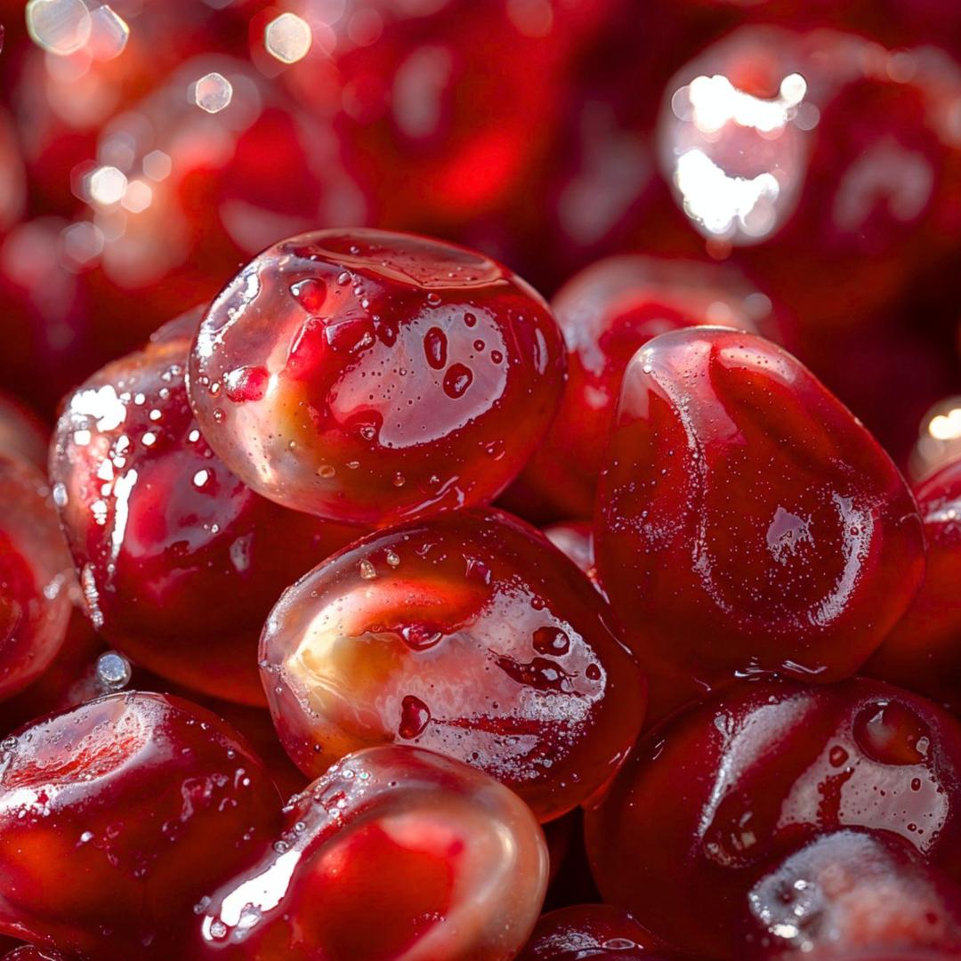 主体:一大簇饱满鲜亮的石榴籽,布满整个画面,红宝石般的颜色夺目醒目。籽粒们紧密排列,与中间点缀的奶油色海绵质感的果肉膜质成鲜明对比。