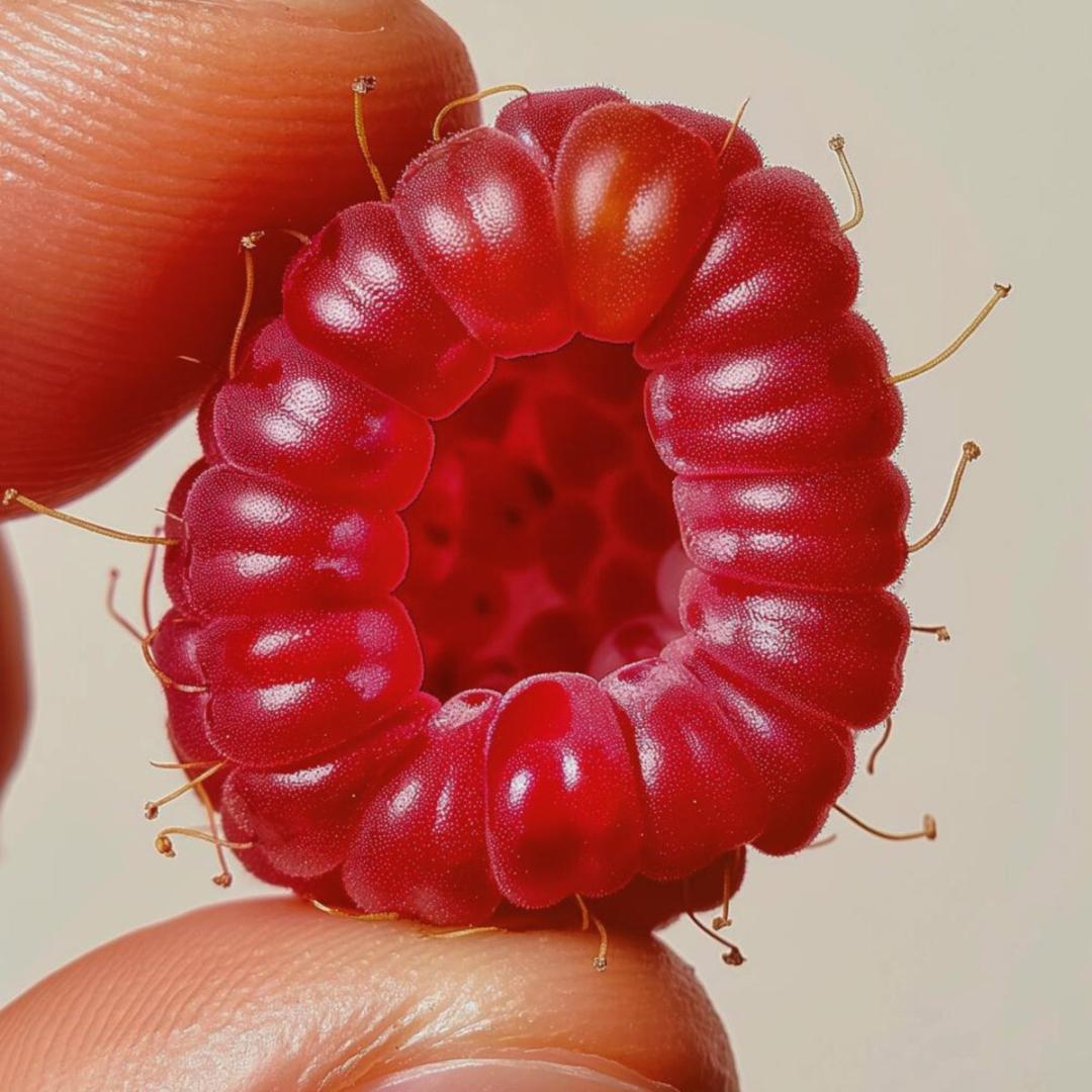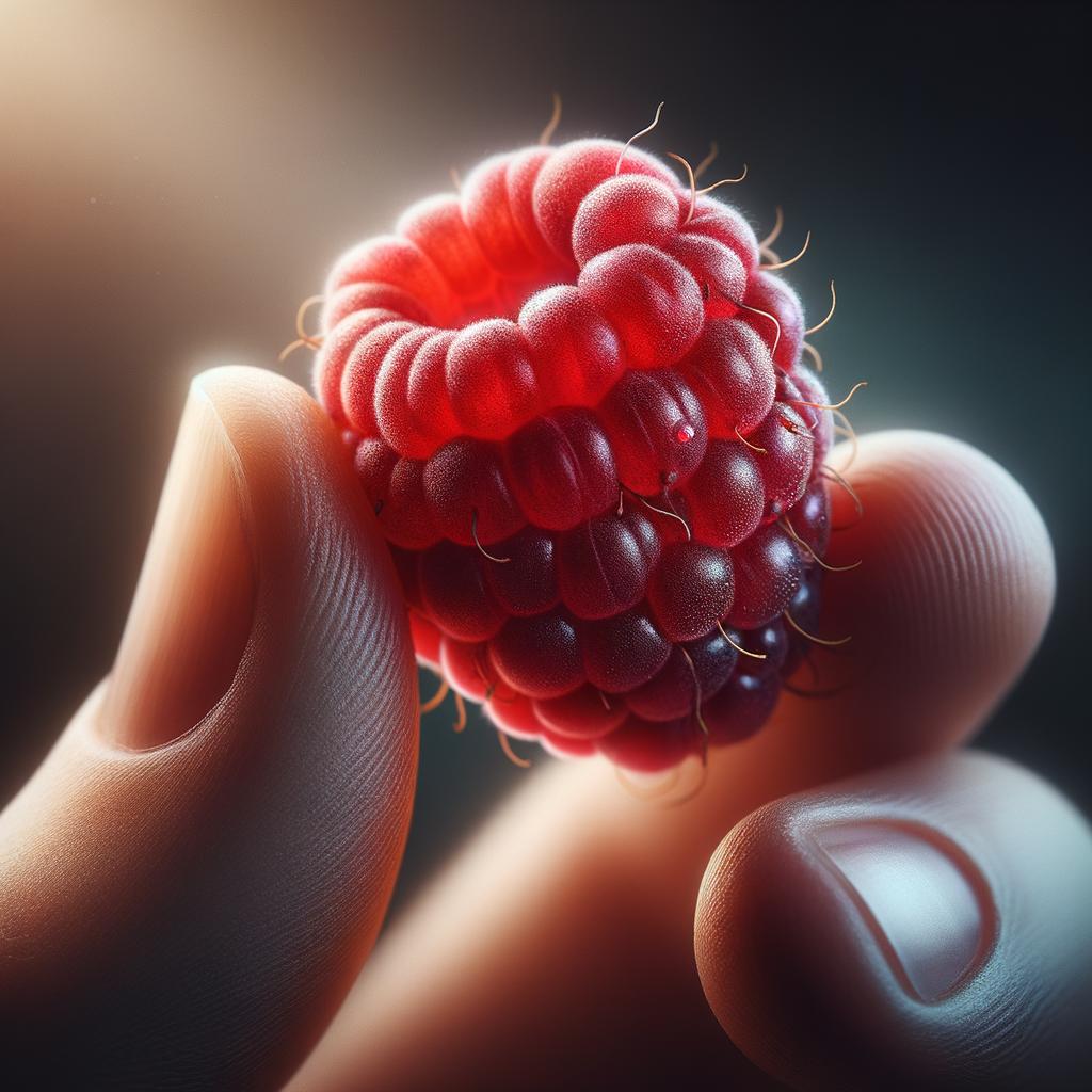 A single, ripe raspberry is the subject of this image, presented in vivid detail. Each individual drupelet, plump and glistening with moisture, stands out in a rich, red colour that suggests a juicy and fresh quality. The raspberry is delicately held between the thumb and forefinger, which have neatly manicured nails and appear soft, adding a human element to the composition. The background is deliberately blurred, ensuring the raspberry commands the viewer's focus. Additional elements, like the fine hairs on the drupelets that catch the light, contribute to the tactile realism of the fruit. The soft shadows cast by the fingers create an effect of depth. Overall, the composition is an intimate and detailed celebration of natural simplicity, emphasising the texture and freshness of the raspberry.