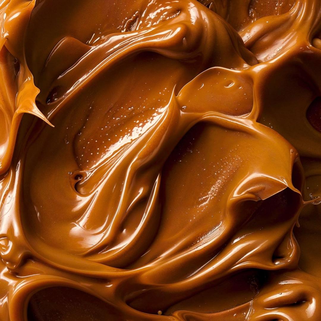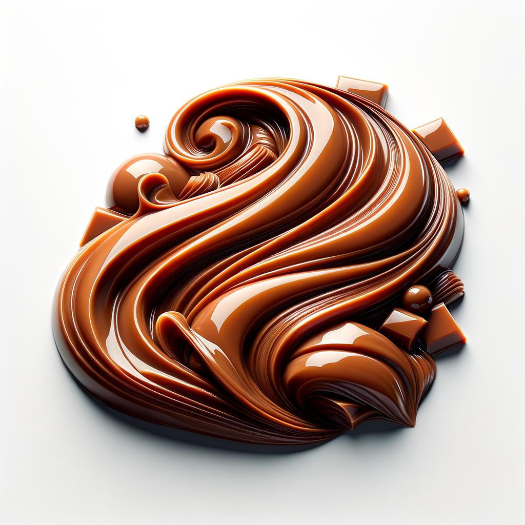 A detailed depiction of luscious, shiny caramel, featuring evident swirls and sleek surfaces, positioned atop a stark white backdrop to enhance contrast. Additional emphasis is placed on the texture and chromatic richness, underscoring its opulent make-up and intense brown shade. The imagery aims to embody the sumptuousness of artisanal melted chocolate or an elegant confectionery, presented in an aesthetically pleasing manner
