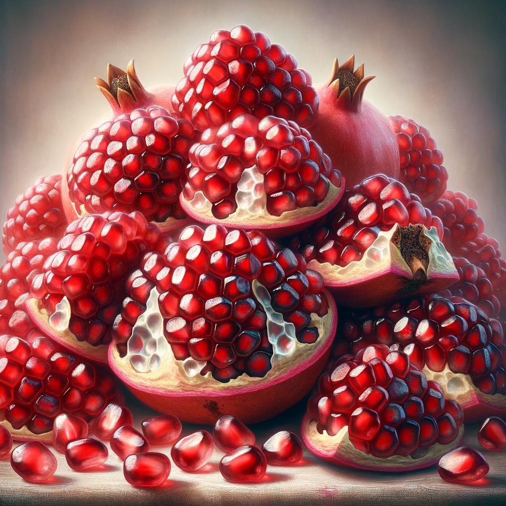 A cluster of ripe pomegranate arils, vivid ruby-red and plump, closely packed and occupying the entirety of the frame, with snippets of the pomegranate's cream-coloured, spongy membrane providing contrast against the glistening seeds; the seeds themselves exhibit a translucent quality that captures light, enhancing their jewel-like appearance; all set against a backdrop that fades into soft focus, drawing attention to the intricate details and dewy texture of the arils in the foreground; composed to evoke a sense of abundant freshness and natural beauty.