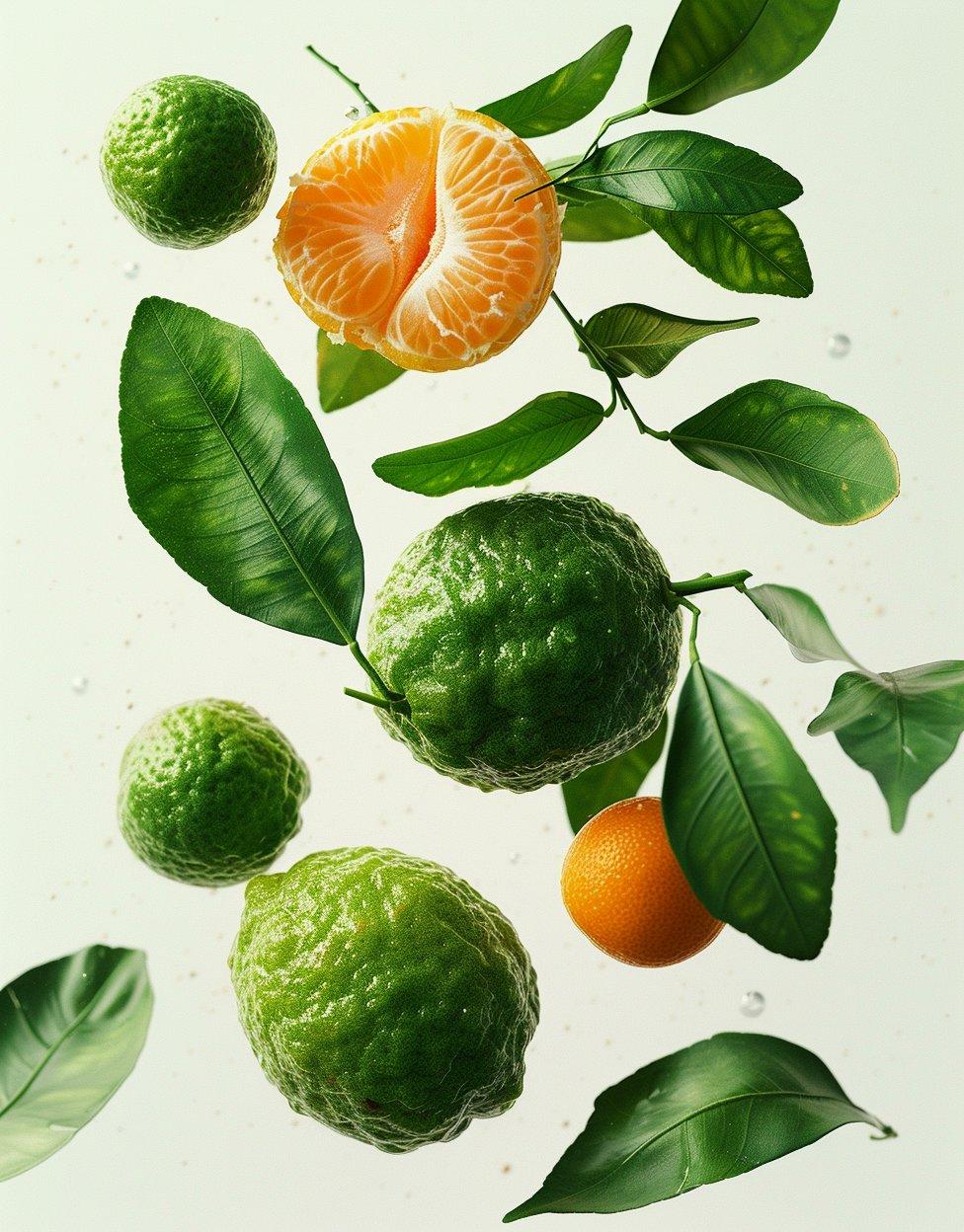 A vertical alignment of three citrus fruits with accompanying leaves. A stark white backdrop that enhances the vivid colours of the subjects. Water droplets on the leaves to convey freshness, and the gradation of ripeness from unripe green at the top to a mature wrinkled texture at the bottom. The glossy sheen on the fruits and leaves suggesting recent harvest or dew. A conceptual display of the citrus lifecycle, or variety, creating a vibrant contrast between colours and textures, invoking a sense of organic growth and vitality。