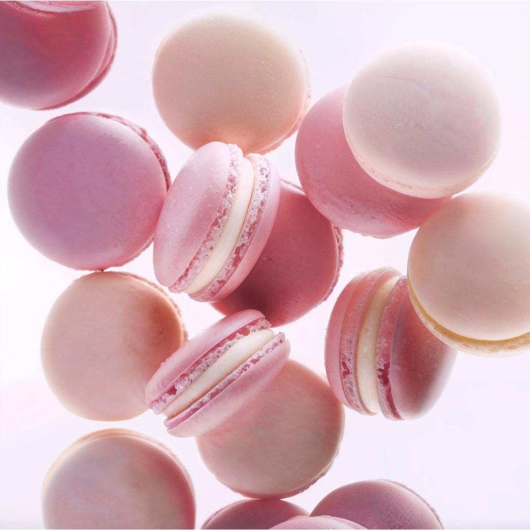 A cluster of pastel-coloured macarons in shades of pink and cream, floating in mid-air against a white background, with soft shadows casting a gentle depth beneath each one. The macarons have a matte finish with tiny, sugary beads of condensation, suggesting a fresh, delicate texture. The scene is illuminated by a diffused light that creates a subtle glow on their surfaces, enhancing their dreamy, candy-like appearance. The composition is balanced and airy, with the macarons arranged in a way that allows the viewer's eye to wander from one sweet treat to the next in a seamless flow of confectionery delight