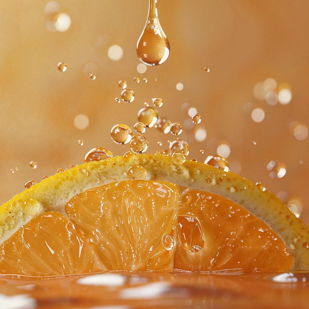 动态效果: 作品巧妙地捕捉到一滴飞溅的橙汁在空中的瞬间