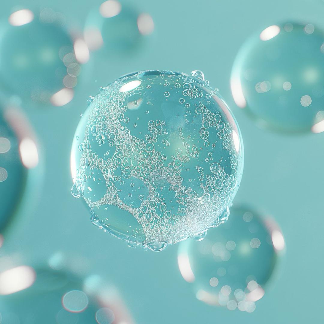 A close-up view of several turquoise soap bubbles with varying sizes on a light blue background. The focus is sharp, capturing the shimmering highlights and intricate swirls within the bubbles. In the background, a soft gradient of white to teal represents a liquid surface, subtly suggesting water without explicit detail. Additional elements include smaller, frothy bubbles clustered around the larger, clear ones, creating a sense of depth and texture. The effect is one of delicate beauty and purity, with a hint of freshness evoked by the cool colour palette. The overall composition balances the simplicity of the subject with the complexity of the patterns within each bubble and the gentle contrast between the different sizes and the background gradient