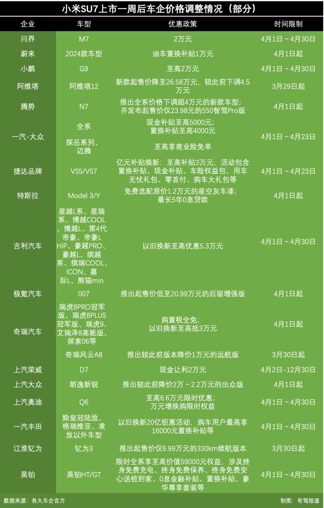 自小米SU7上市后,已有至少17家车企对旗下车型进行了售价下调或推出了限时优惠。