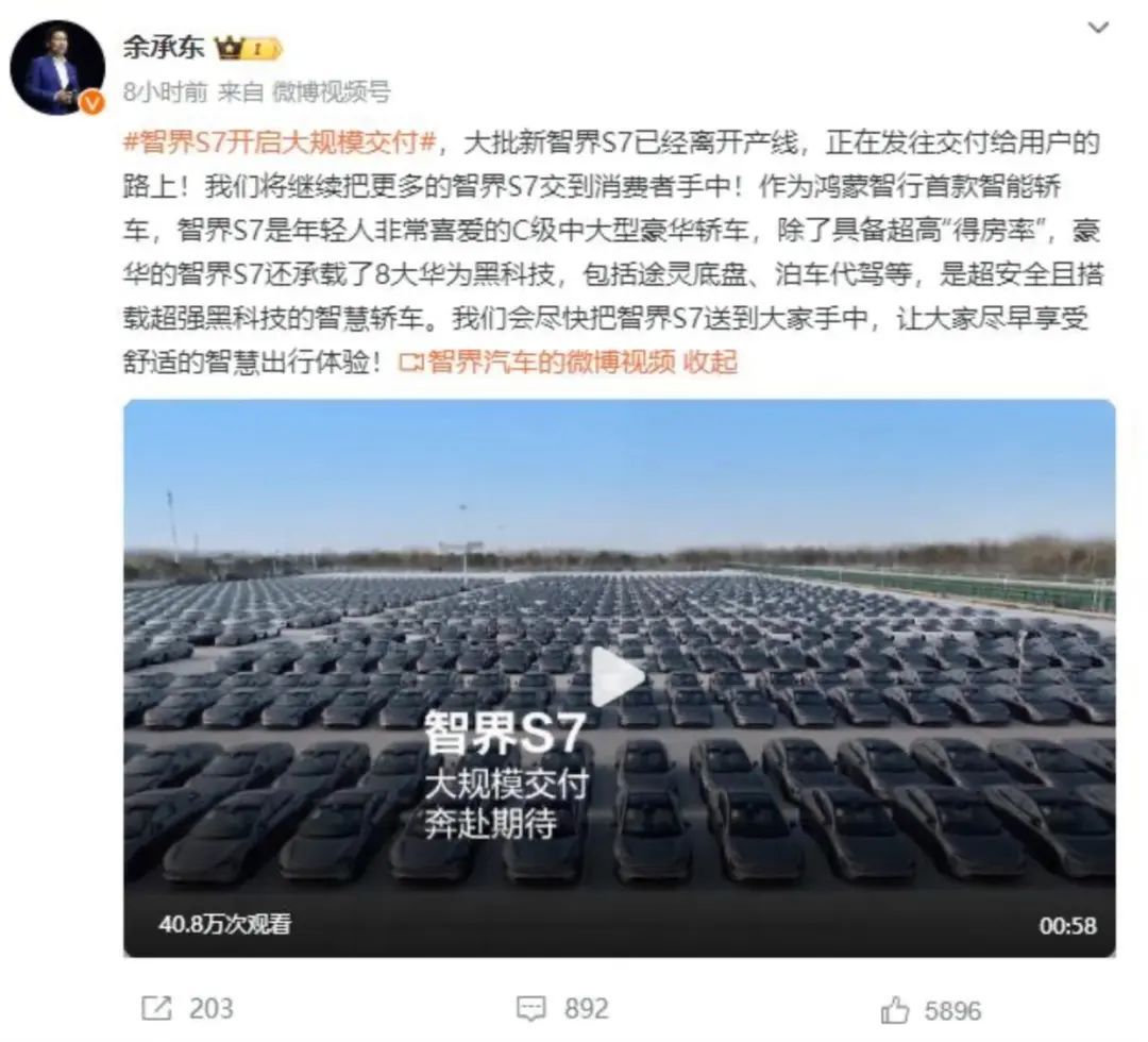 同样是在小米SU7上市的一天以后,华为智能车BU董事长余承东在个人微博上表示,华为与奇瑞汽车合作打造的智界S7将开启大规模交付。而在4月1日,华为与赛力斯合作的问界品牌则宣布,将新M7入门版车型的价格下调2万至22.98万元。
