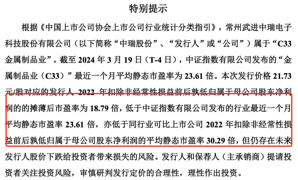 中瑞股份本次发行价格21.73元/股,对应的公司2022年扣除非经常性损益前后孰低归母净利润的摊薄后市盈率为18.79倍,低于中证指数发布的行业最近一个月平均静态市盈率23.61倍,亦低于同行业可比上市公司2022年扣除非经常性损益前后孰低归母净利润的平均静态市盈率30.29倍。
