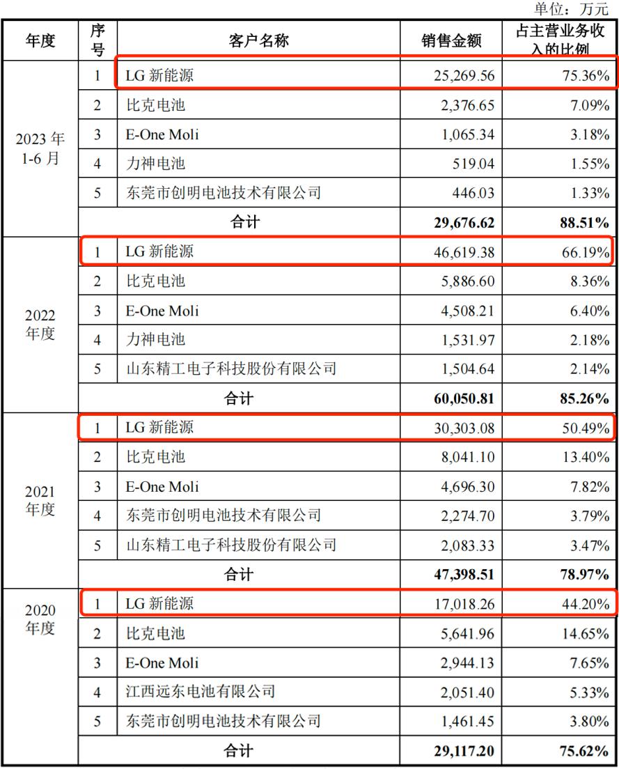 而长期占据公司第一大客户位置的正是LG新能源。报告期内,公司向LG新能源的销售金额分别为1.70亿元、3.03亿元、4.66亿元和2.53亿元,占当期主营业务收入的比例分别为44.20%、50.49%、66.19%和75.36%,逐步增长。