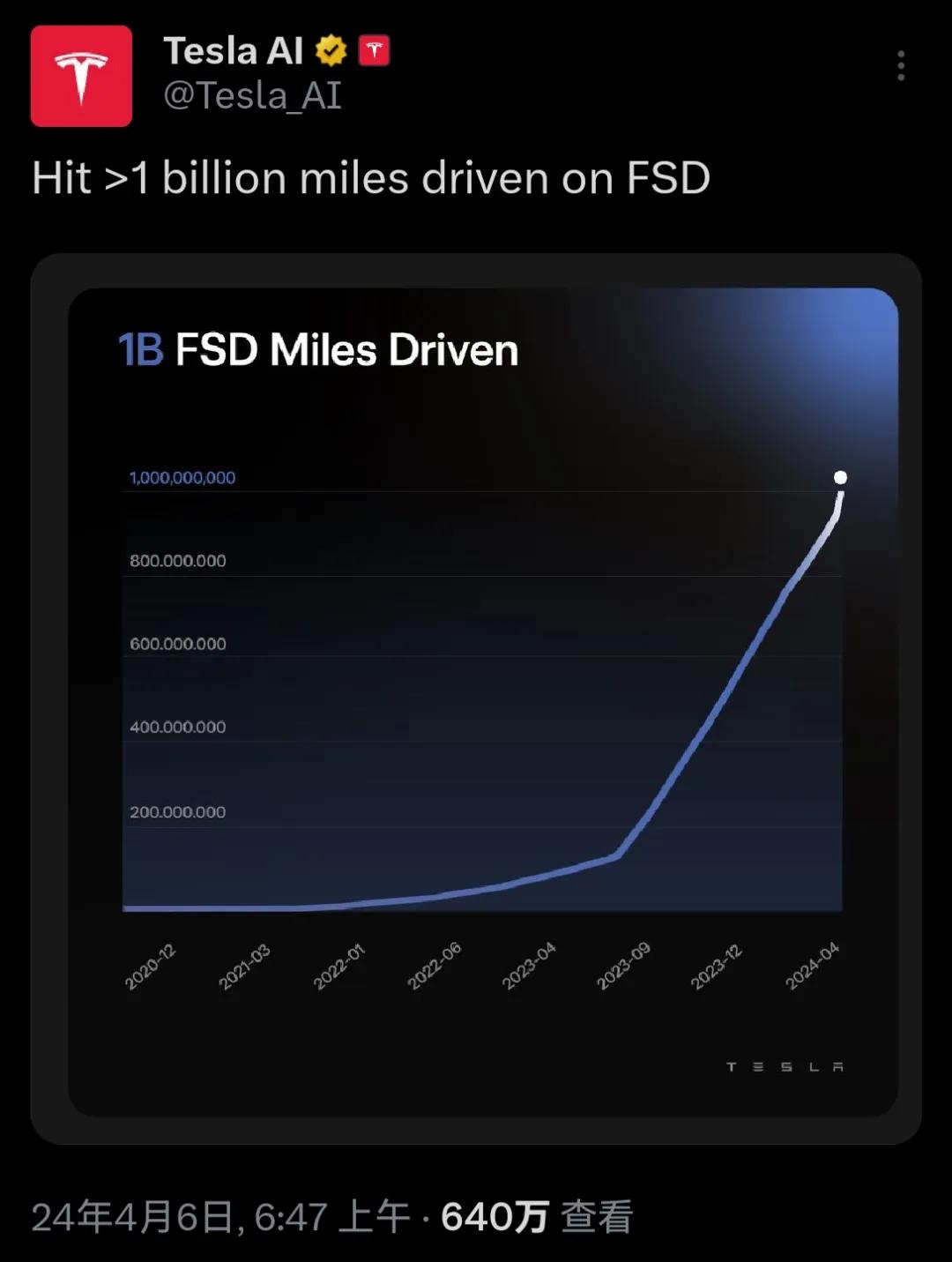 马斯克发文后没过多久的时间,特斯拉AI官方账号发布了特斯拉在过去三年半所取得的成就,实现了全自动驾驶累计行驶10亿英里的壮举,以此证明特斯拉在自动驾驶领域的雄心壮志。