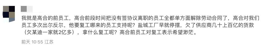 还有不少高合的前员工和供应商在这条帖子下评论,称高合还欠着他们的 工资和货款没结清。