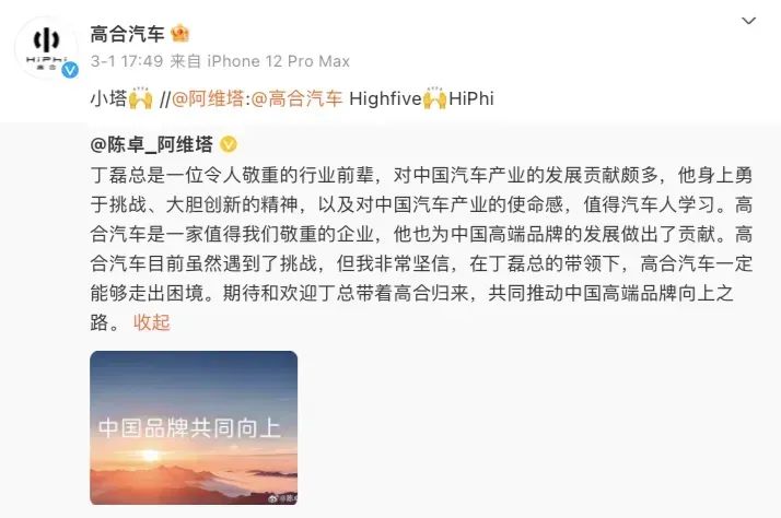 阿维塔也在当时和高合有过互动,阿维塔总裁陈卓在社交媒体向高合和丁磊致意,发文称“ 期待和欢迎丁总带着高合归来”,阿维塔官方和高合都转发了这条互动微博。