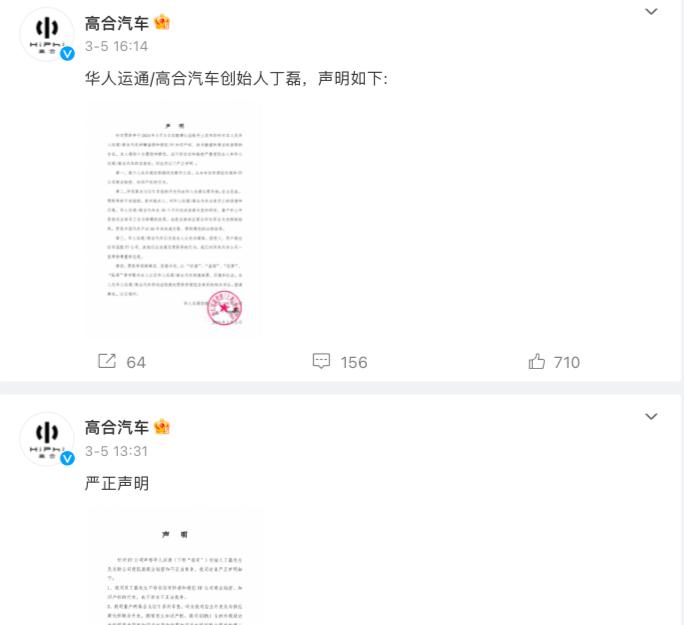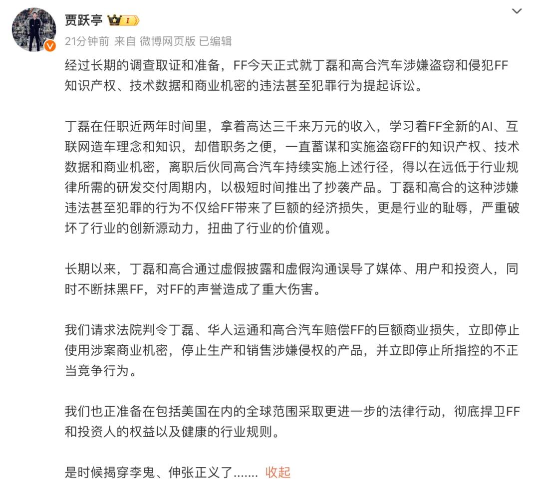 对于贾跃亭和FF的起诉,高合和丁磊连发两份声明回应,称是 不实指控、污蔑和诽谤。