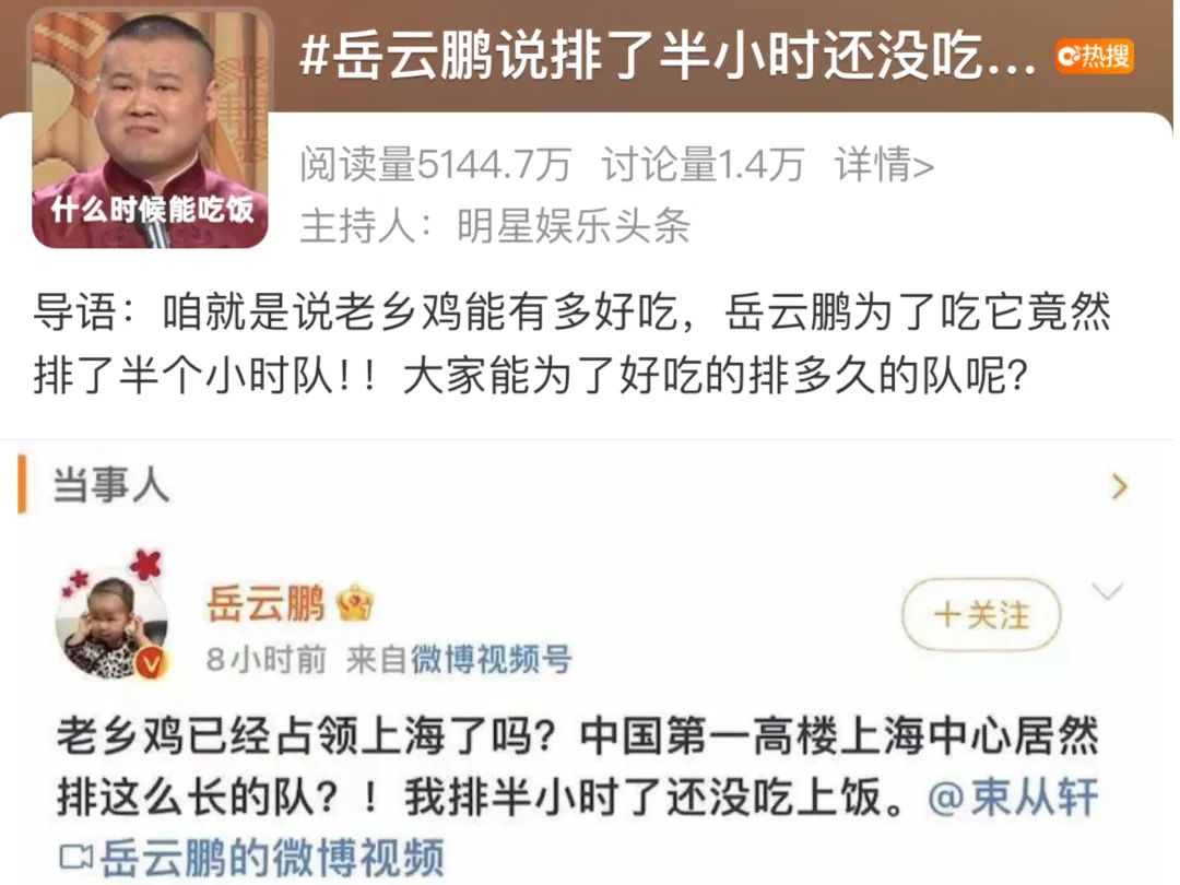 举例来说,一些外地品牌会将上海中心视作打入上海市场的重要一站。如中式餐饮老乡鸡,将连续进驻“中国第一高楼”“中国第二高楼”作为营销点,“岳云鹏在上海中心老乡鸡店排了半小时队”,也一度作为话题登上热搜榜。