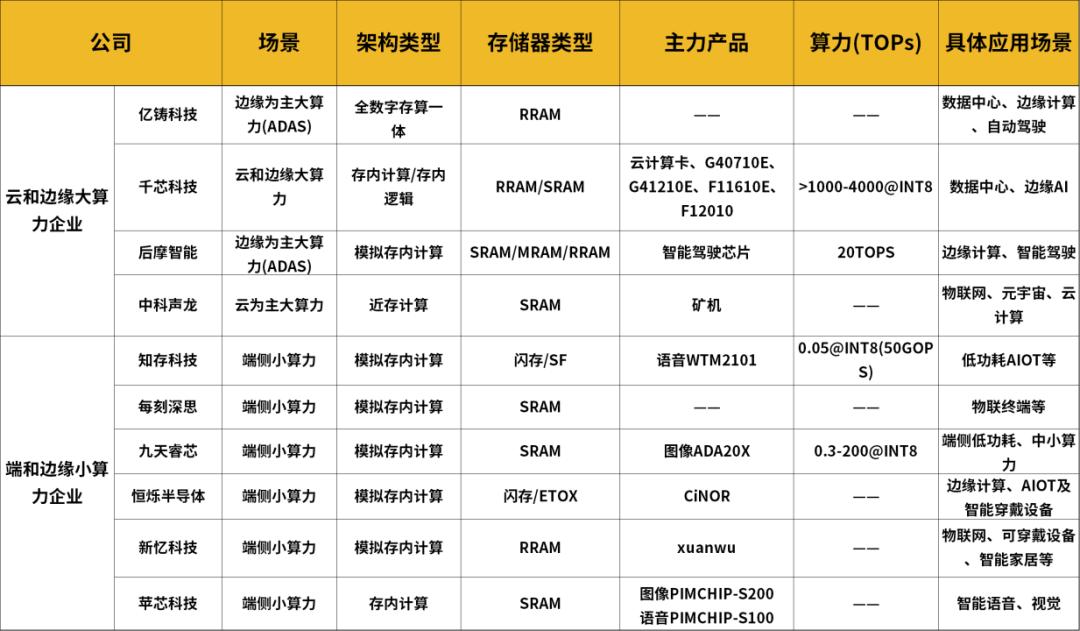 国内初创企业则聚焦于无需考虑先进制程技术的存内计算。其中,知存科技、亿铸科技、九天睿芯等初创公司都在押注PIM、CIM等“存”与“算”更亲密的存算一体技术路线。亿铸科技、千芯科技等专注于大模型计算、自动驾驶等AI大算力场景;闪易、新忆科技、苹芯科技、知存科技等则专注于物联网、可穿戴设备、智能家居等边缘小算力场景。