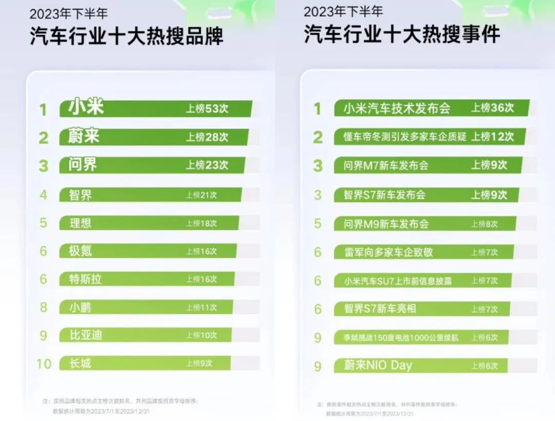 自从 2021 年宣布造车的 3 年以来,小米汽车频频登上热搜。在 2 月份微博发布的 2023 年下半年汽车行业十大热搜品牌和事件中,小米以远超第二的优势,拿到了双第一。