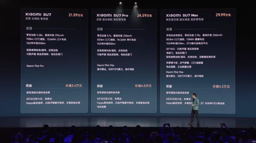有意思的是,最终小米 SU7 尘埃落定的价格:标准版 21.59 万元,pro 版本 25.59 万元,max 版本 29.99 万元,显然没有满足大众对“年轻人第一台车”的诉求,但这并没有耽误 SU7 的销量和声量。