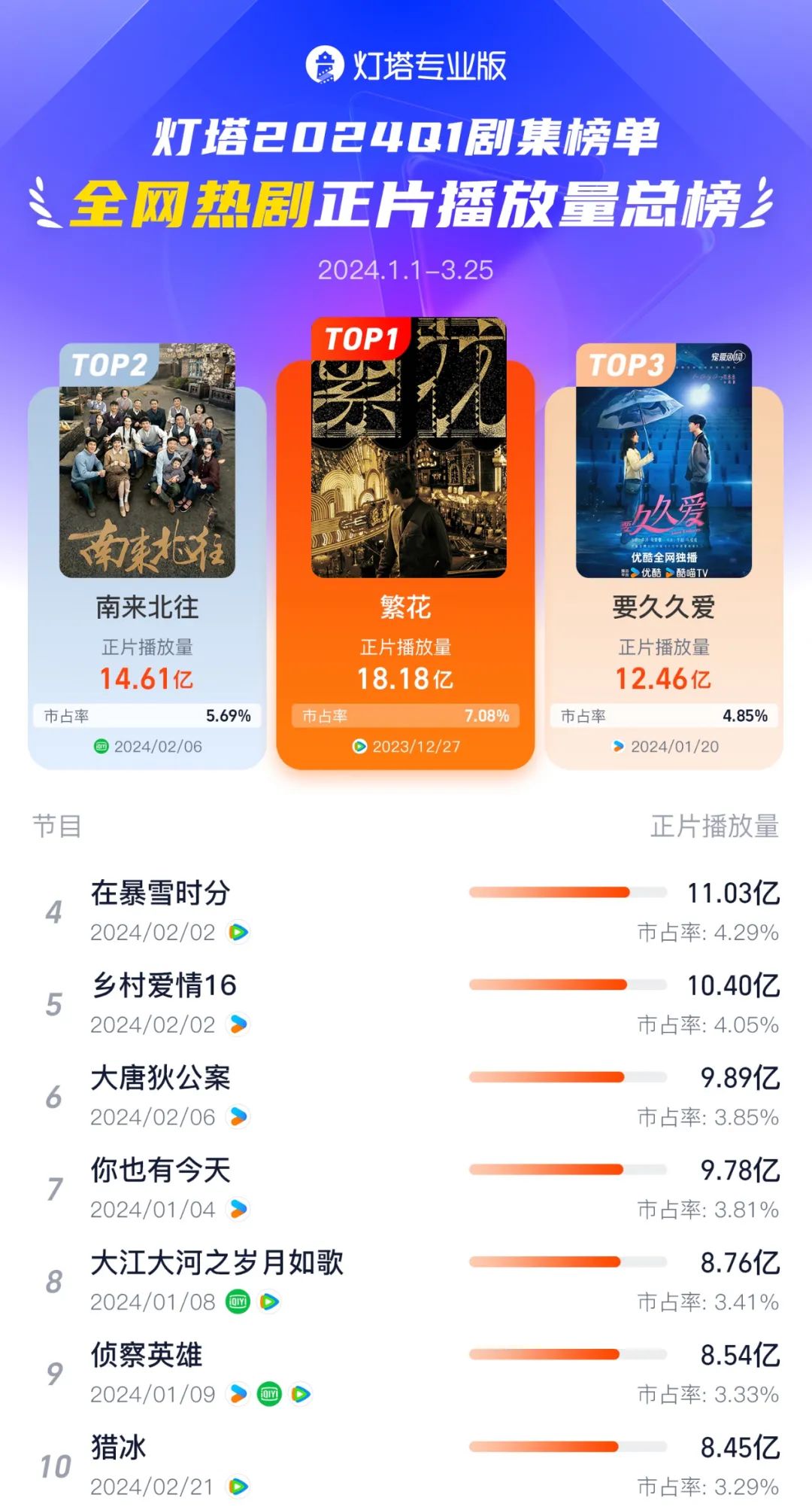 刚刚过去的一季度,剧集市场迎来“开门红”,《繁花》《南来北往》《与凤行》接连把观众的追剧热情推到一个新高度,虽然没有像去年同期一样诞生《狂飙》这样的超级爆款,但整体表现依然可圈可点。