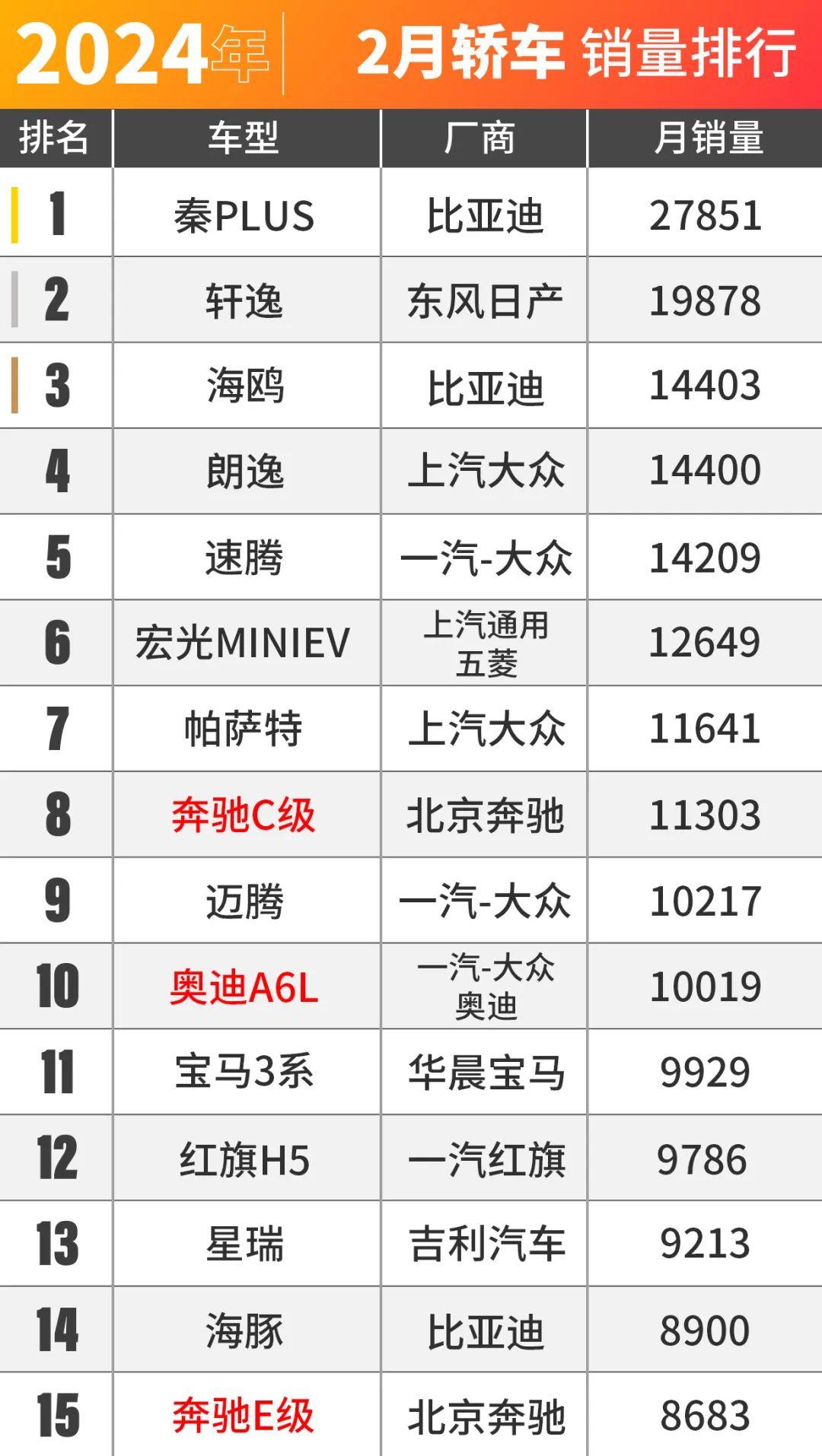 2024年2月,BBA四款车冲上轿车销量总榜前15。
