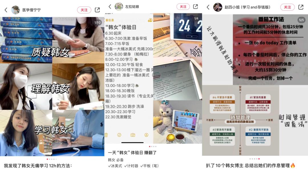 有时韩女是发疯学习博主,是高度自我负责的精英女性人设。为了备考公务员、律师等考试每天学习16个小时不在话下,“昨天睡了3个小时,已经很满足了”是常见的表达。