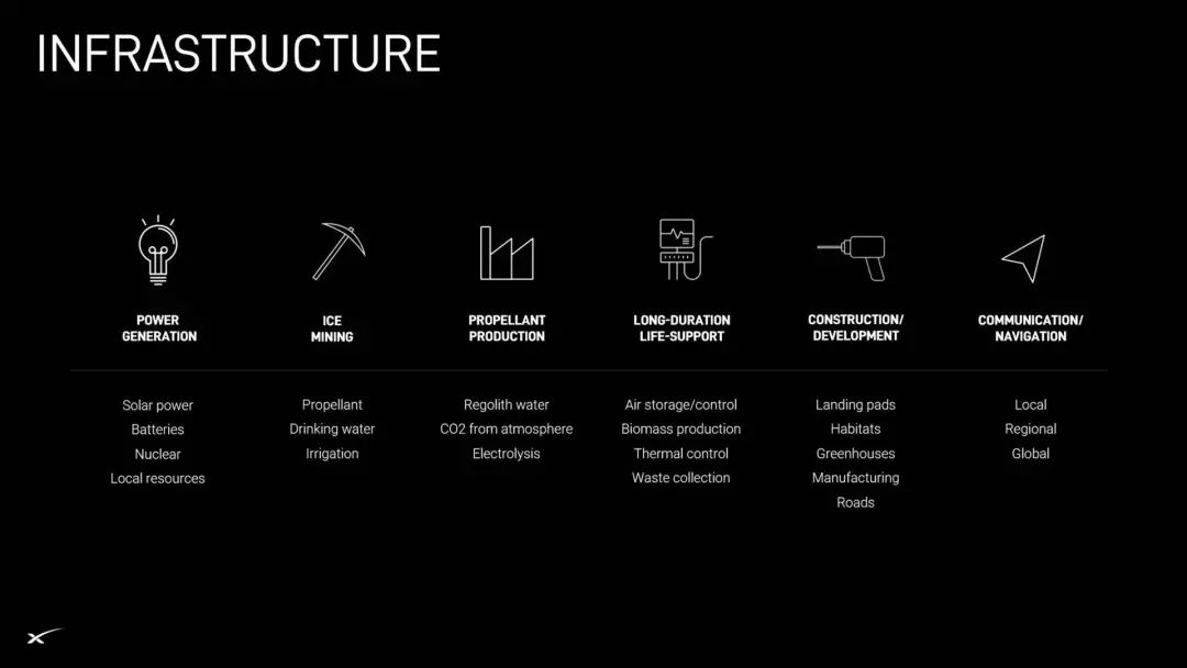 因为这是「马车」,我们首先需要「马」。所以火箭是马,然后才能有这些研究「马车」,但最终我们将需要所有这些东西:大量的发电,采矿,冰矿开采,推进剂制造,长期生命支持,大量的建设,全球通信等等。