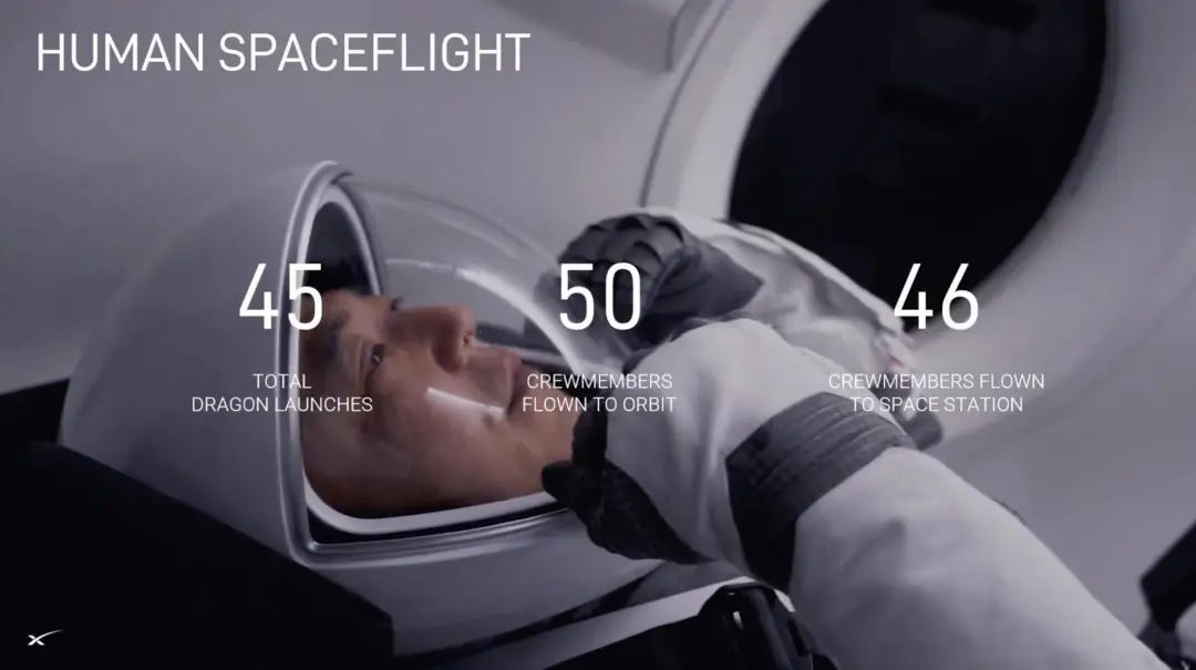 接下来是「龙」。龙飞船已经成功执行了 45 次发射任务,令人惊叹!我们已经将 50 名航天员送入轨道,其中 46 人到达了空间站。