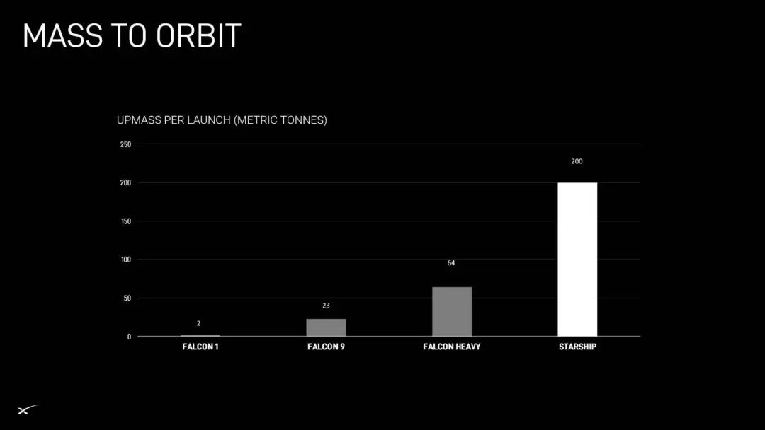 猎鹰 1 每次可以将大约半吨的质量送入轨道,而星舰 3 每次可以携带的质量将是猎鹰 1 的 400 倍,而成本却比猎鹰 1 还要低。