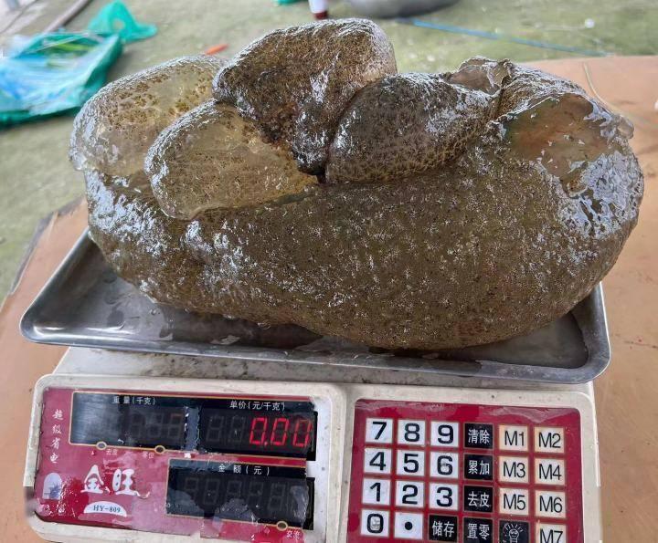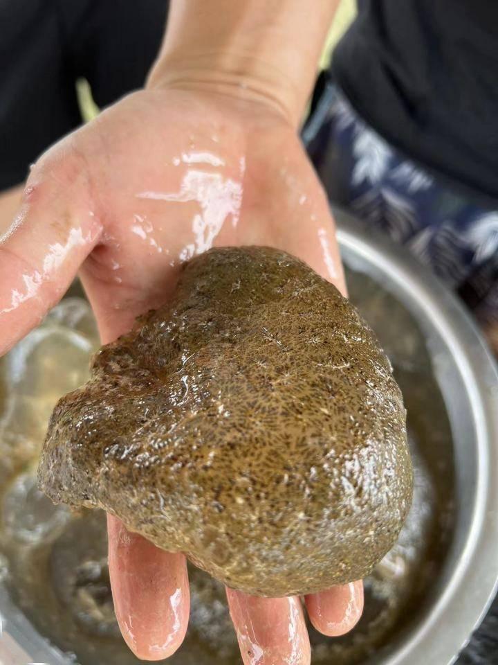 给其中一块称重后,发现它大概有六七斤重,以为它是“太岁”。不过,怎么看着有点像桂花糕呢?