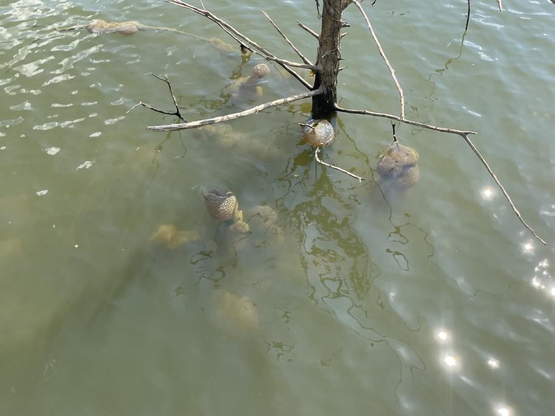今年3月,有人在俄克拉荷马州的麦基溪水库划船,发现在水下的树枝上倒挂着一串串黏糊糊的棕色球状物。