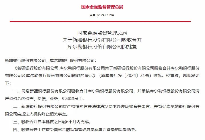 4月9日,国家金融监督管理总局批复,同意新疆银行股份有限公司(以下简称“新疆银行”)吸收合并库尔勒银行股份有限公司(以下简称“库尔勒银行”),并承接库尔勒银行清产核资后的资产、负债、业务、机构和员工。