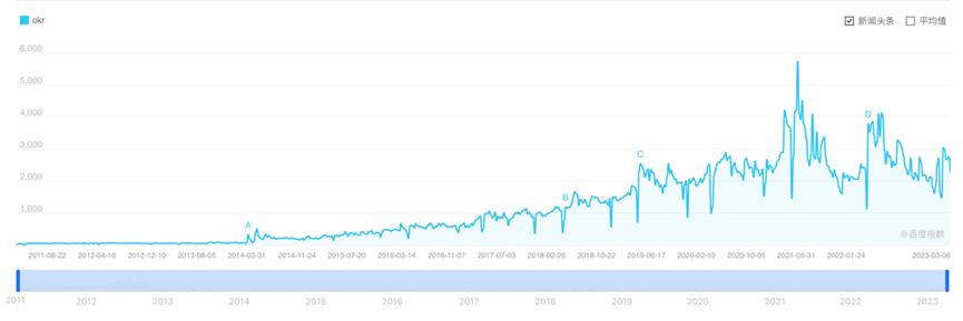 OKR的百度指数变化趋势(2011年8月-2023年3月),图源:百度指数