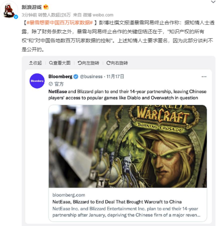 图:彭博社撰文称暴雪与网易终止合作的关键症结还在于“知识产权的所有权”和“对中国各地数百万玩家数据的控制”