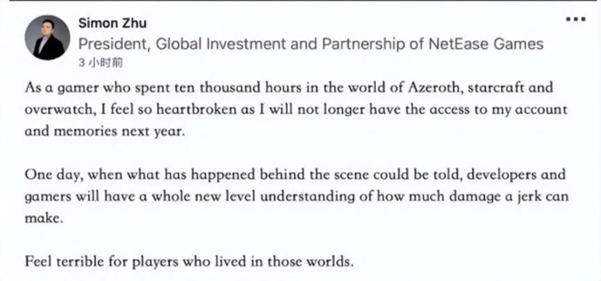 当时,网易游戏全球投资及合作总裁朱原曾发文表示,“作为一个曾在艾泽拉斯、星际争霸、守望先锋的世界中度过了成千上万小时的老玩家,我也对在明年即将失去我的账号感到心痛。有朝一日,当一切都尘埃落定,内幕被揭开之时,开发者和玩家们将对 ‘一个傻瓜能造成多大的伤害’ 产生全新级别的认知。我对所有要面对此事的玩家感到悲哀。”