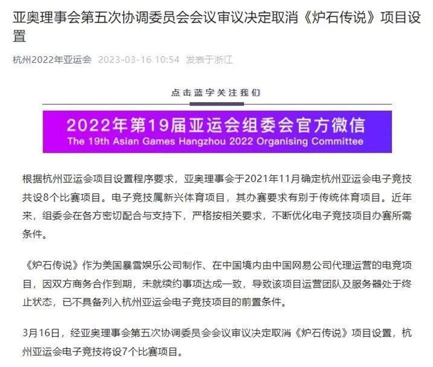 图:亚奥理事会第五次协调委员会会议审议决定取消《炉石传说》项目设置”