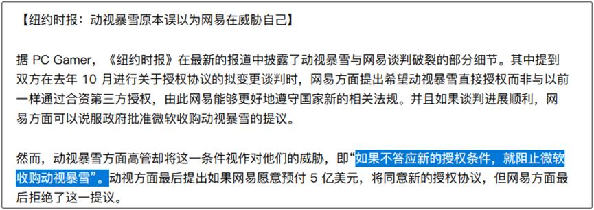 具体来说,就是动视暴雪、网易的合约期限即将到期,谈续约时,网易希望动视暴雪这次可以直接给自己游戏授权(之前是通过合资第三方授权),这样网易能够更好地遵守国家新的相关法规。如果进展顺利的话,网易还可以为动视暴雪当说客,说服政府批准微软收购动视暴雪。