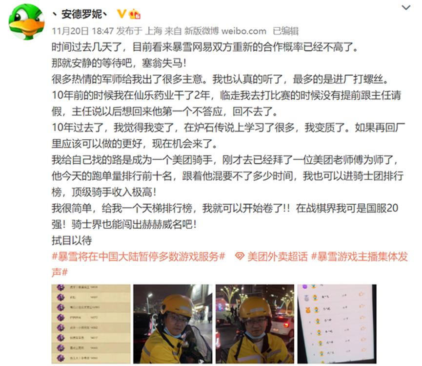 图:《炉石传说》主播安德罗妮发微博表示《炉石传说》关服后要去做美团外卖骑手